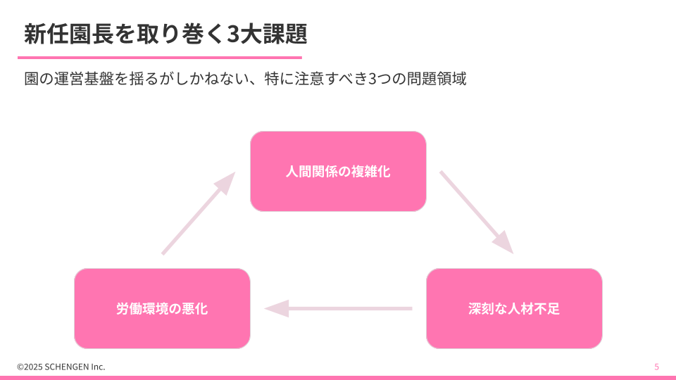 スタッフや先輩園長とのコミュニケーション不足は、一見些細な行き違いが深刻な摩擦を生むきっかけにもなり得ます。また、保育士不足の業界動向が続いていることから、新たな採用や離職防止策を常に検討する必要があります。
