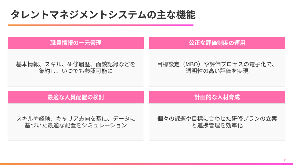 それでは、「タレントマネジメント」を使うことで、具体的にどのような課題解決につながるのでしょうか。